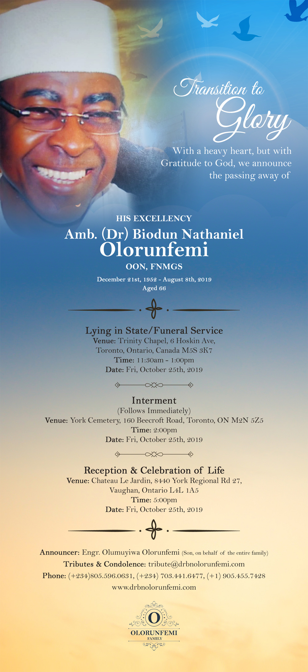 Born on 21st December, 1952 in the village of Emu (Oworo Community), Lokoja, Kogi State, Nigeria, Dr. Olorunfemi was a devoted husband, a loving father and an iconic leader who never turned his back on anyone in need. He lived a fulfilled life, one worthy of emulation, driven by compassion and founded upon the love of Christ.